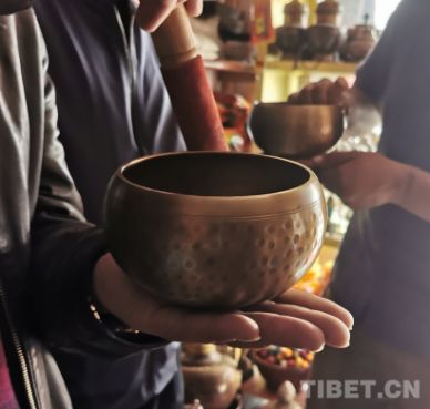 一位店主告訴我,sing bowl在印度和尼泊爾都有,但印度的一般稍大些,尼泊爾的稍小些。我仔細對比了店中的兩種碗,確實如此。同時,有些碗內部有紋飾,外部也有相應簡易圖形的點綴,比如圓形斑點,但有些碗的內壁和外壁無任何紋飾。一般有紋飾的價格要稍高一些,價格從200元至350元不等。但分辨sing bowl質量最重要的是看其“唱歌”的音質與在手上產生震動的幅度,一般以音質低沉雄厚為佳,以震動引發(fā)全身共鳴的程度高為好。但我們的現(xiàn)場演示表明,個人使用的技巧也很重要。