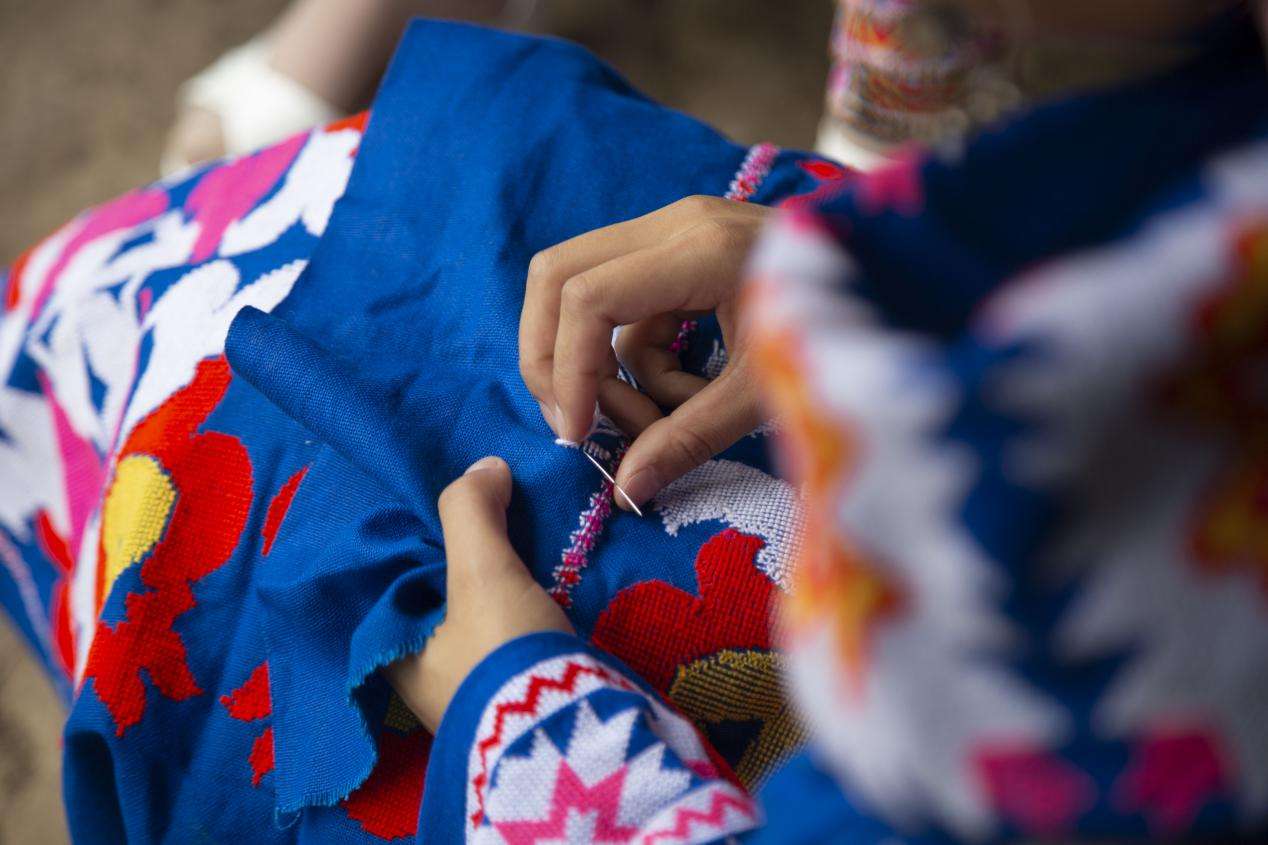 苗族的傳統(tǒng)服飾出自本民族婦女的雙手,服飾中的刺繡是制作工序當中最為復雜的一項。閑暇時分,苗族婦女三五成群,坐著故居前,伴著習習涼風刺繡。刺繡圖案的多少和優(yōu)美與否,在一定程度上,標識了苗族婦女的勤勞能干,所以壩樓村苗族婦女的刺繡圖案復雜多變,集優(yōu)美與實用一體。刺繡是苗族源遠流長的手工藝術,是苗族服飾主要的裝飾手段,是苗族女性文化的代表。苗族刺繡借助色彩的運用、圖案的搭配,達到視覺上的多維空間。其中挑花也稱數(shù)紗繡,是苗族特有的技藝,不事先取樣,利用布的經(jīng)緯線挑繡,反挑正取,形成各種幾何紋樣。