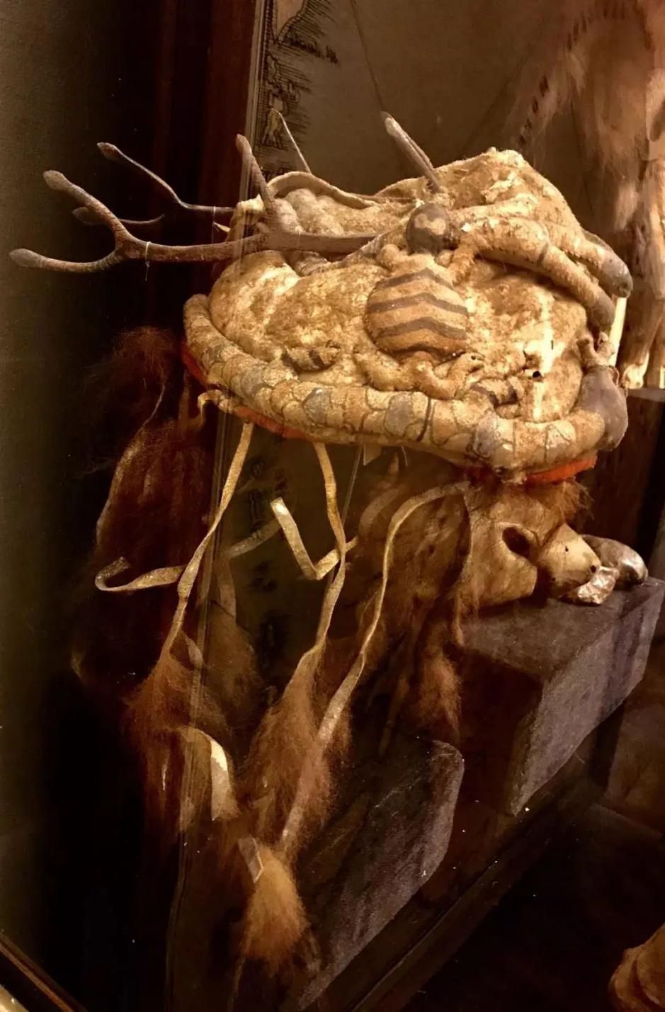 展區(qū)內(nèi)還陳列著幾套保存完整的薩滿服飾,有鹿皮、獸皮、魚皮和纖維等多種材料。與國(guó)內(nèi)留存的薩滿服飾不同的是其鹿角帽的制作,鹿角帽上裝飾著龜、蛇和神偶形象,頂端八岔鹿角的材料是金屬。