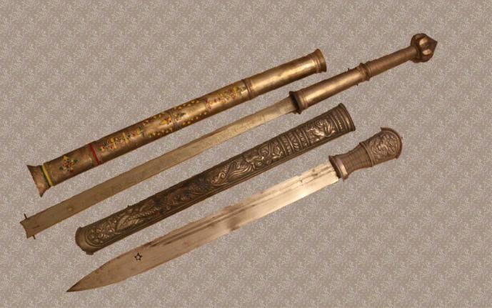 ★配刀把和刀鞘。刀把和刀鞘多用楠木加工而成,有的用銅、銀皮包裹,上面雕刻裝飾有各種花紋圖案,如“猛虎長嘯”“東山日出”“飛燕迎春”“十二屬相”等,佩刀上還系有紅纓背帶,匕首的把多用牛角雕刻裝飾而成。