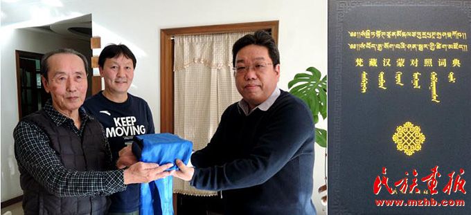 烏日根桑格(中)利用業(yè)余時(shí)間,與民族出版社蒙古文部原主任、資深編審卓日格圖先生(左一)合作出版《梵藏漢蒙對照詞典》。圖為向?qū)W者贈閱該詞典。