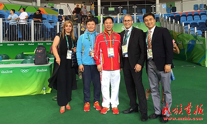 2016年,里約奧運(yùn)會期間,烏日根桑格(左)與中國國家柔道隊(duì)隊(duì)員于頌(中)、國家柔道隊(duì)原主教練程志山合影留念。
