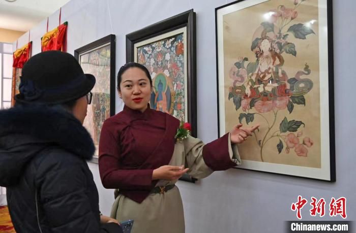 王天文是該協(xié)會為數(shù)不多的女性,自幼學(xué)習(xí)國畫。此次她的展出作品《花與佛》進(jìn)行了唐卡創(chuàng)新,將漢地工筆繪法的花卉與唐卡白度母形象融合。因?yàn)闊釔鄄匚幕?011年她從家鄉(xiāng)河北到西藏學(xué)習(xí)唐卡,希望能探索唐卡與不同繪畫種類方式的結(jié)合。
