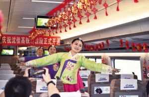 沈佳高鐵長(zhǎng)白山至敦化段開(kāi)通運(yùn)營(yíng),將促進(jìn)沿線(xiàn)旅游業(yè)和冰雪經(jīng)濟(jì)快速發(fā)展,進(jìn)一步加強(qiáng)民族團(tuán)結(jié),助力長(zhǎng)吉圖開(kāi)發(fā)開(kāi)放、深度融入 “一帶一路”。圖為列車(chē)工作人員在車(chē)內(nèi)表演朝鮮族歌舞。 新華社發(fā)