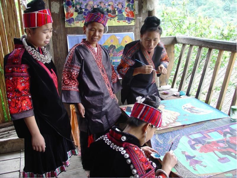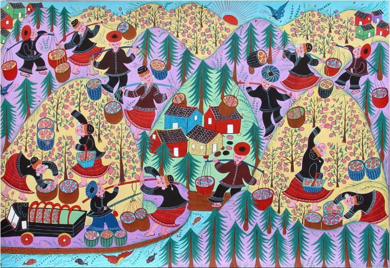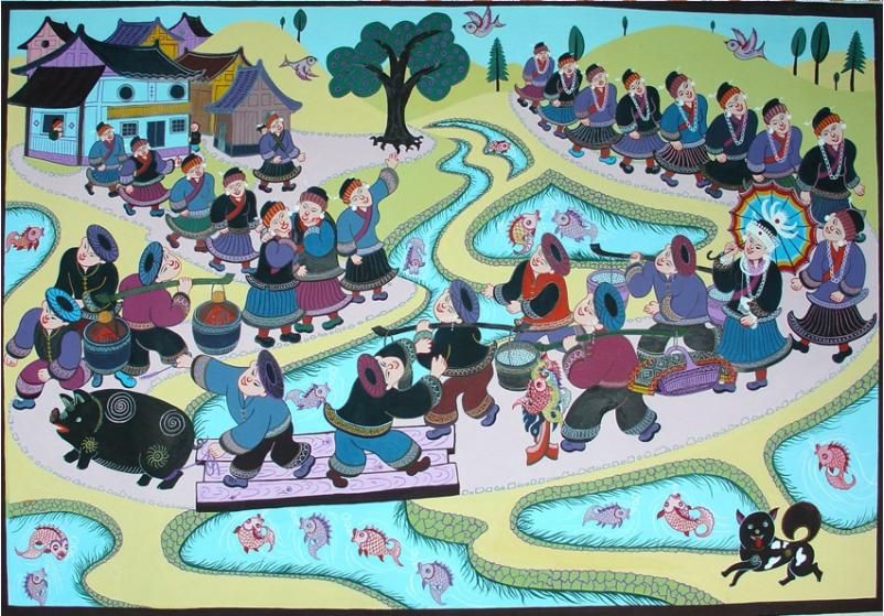 劍河現(xiàn)代民間繪畫源于傳統(tǒng)的苗族刺繡文化,是苗族刺繡文化的另一種表現(xiàn)形式和藝術(shù)升華。傳統(tǒng)的苗族文化多以服飾、歌舞為載體,并以刺繡及演唱等形式進(jìn)行表現(xiàn)和傳承。早期劍河現(xiàn)代民間畫即脫胎于具有適用性的苗族刺繡樣稿——剪紙和手繪刺繡粉本,換言之,手繪的苗族刺繡粉本便是劍河現(xiàn)代民間繪畫的雛形,劍河第一批優(yōu)秀的現(xiàn)代民間畫作者,即是原當(dāng)?shù)厥掷L粉本的能工巧匠。劍河現(xiàn)代民間繪畫多以苗族神話傳說(shuō)中的故事情節(jié)和民俗節(jié)日、生產(chǎn)活動(dòng)等內(nèi)容為題材入畫,素材涵蓋自然界花鳥蟲魚及人物、家畜等具體形象,造型稚拙天真,設(shè)色濃艷,對(duì)比強(qiáng)烈。作品傳達(dá)出典型的地域民俗氣息及濃厚的鄉(xiāng)土味,便是其標(biāo)志性特征。
