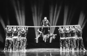 在靜謐的夜空下,首先映入觀眾眼簾的是群舞演員在舞臺中央,用身體構建的人字形“情人房”。房內(nèi)的瑤族姑娘正在小憩,或許是被屋外的動靜驚醒,她推門出外察看,重重的門軸聲劃破了夜的寂靜,原來是愛慕者正攀在一根竹竿上向自己示愛?!盁o竹不成瑤”,舞蹈伊始,最核心的道具——一根長約8米、杯口粗的竹竿就出現(xiàn)了。借助竹竿,群舞演員通過造型組合及隊形變換,不斷再現(xiàn)生活場景:山坡上、小橋上、屋檐下、窗欞邊……情隨景遷、情景交融,生活圖景和人物情緒巧妙地融合在一起,營造出一種別樣的意境,極大地引發(fā)了觀眾的聯(lián)想。