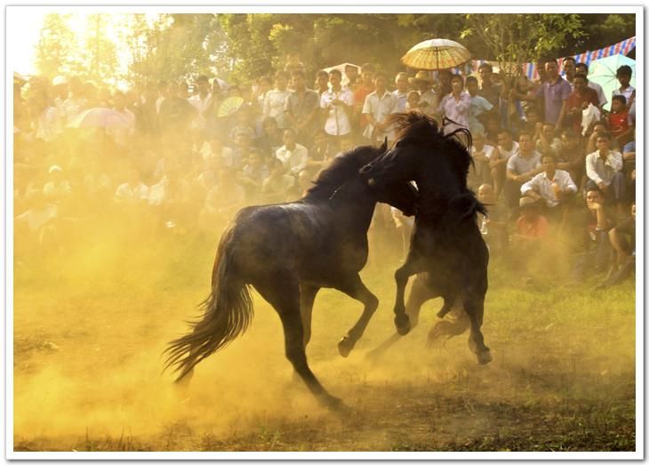 斗馬時,先牽出一匹年輕母馬到場作媒介挑逗公馬,出場的兩匹公馬都想親近母馬,由此引發(fā)一場決斗。誰都想打敗對方而占有母馬,都使出渾身解數,酣戰(zhàn)不止,直至決出勝負。