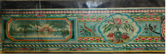 達拉特旗地區(qū)的墻圍畫高度一般在70厘米左右,其長度則依炕的大小而定。炕上部分的畫是主體,在結構上有一套固定的模式,即以上下兩組邊道,按照一定的規(guī)格布置形成主體框架,中間等距離安排各種畫空,既具完整對稱的裝飾形式美感,又具簡繁對比、主從相映的豐富表現(xiàn)內(nèi)涵。邊道圖案種類繁多,有折子邊、卷帶邊、竹筒邊、花邊等。畫空也稱“池子”,有正方形、長方形、扇形、圓形等多種形式。此外,在下邊道與炕距離25-30厘米的范圍內(nèi)是黃顏色的邊子,這樣的設計是避免炕上物件的遮擋和抬高人的視線,便于觀賞。