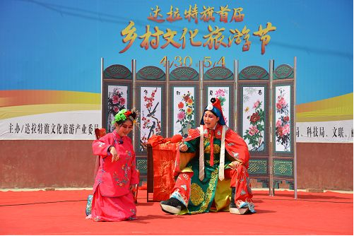 達(dá)拉特道情富有濃郁的地方色彩,生、旦、丑等行當(dāng)齊全,包括“唱、念、做、打”四功,不過由于它演唱內(nèi)容的關(guān)系,以“唱、念、做”三功為主。音樂體制主要為曲牌連綴體,同時(shí)吸收了地方小戲與北路梆子的音樂元素,又兼有地方大戲的部分唱腔曲調(diào),演唱方式以坐唱為主,樂器伴奏分為文場(chǎng)和武場(chǎng),音樂婉轉(zhuǎn)纏綿、節(jié)奏明快,曲調(diào)開朗而流暢,唱白多運(yùn)用地方方言,藝術(shù)風(fēng)格柔美而抒情,充盈了濃郁的鄉(xiāng)土生活氣息。