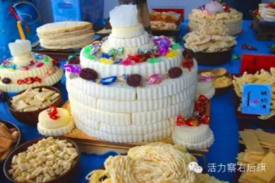 美味之一奶食:草原上的食品之首便是奶食。況且察哈爾人民在歷史上為宮廷專供“奶食”的部落,所制作的奶食品品種豐富、名目繁多,做法千姿百態(tài)。奶食在蒙語中稱"查干意德(ChagaanYidee)",俗稱白色食品。奶食大體可分為液態(tài)奶食、固態(tài)奶食兩類。液態(tài)奶食有鮮奶、淖勞日、爵亥、白油、酸油液、黃油、酸油渣、乳清、酸奶、熟酸奶、酸乳等。固態(tài)奶食有奶皮、奶豆腐、奶雜子、松葫蘆、酸奶酪。奶食品中含有大量的氨基酸、蛋白質(zhì)、油脂、微量元素,對人體機(jī)能有著不可缺少的營養(yǎng)成分,增強(qiáng)免疫力,有保健作用。奶食也被視為珍品,每逢拜年、祝壽、招待賓客、喜慶宴會(huì)等首先以品嘗奶食、敬獻(xiàn)奶酒為最美好的祝愿,這是一種神圣的禮節(jié)。