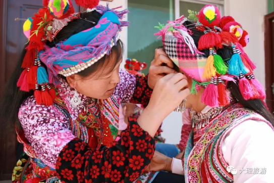 踏歌會(huì)上,來自彌渡彝族聚居地的各村各寨男女老幼穿戴整齊,云集在鐵柱廟,這里便形成了五彩斑斕的彝族服飾比賽場,每位彝族婦女的頭飾就是她心靈手巧的見證。