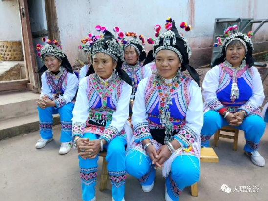 男子頭頂氈帽(又稱氈窩),穿大襟衣、大襠褲,赤足或穿草鞋,披羊皮,外出背皮袋(現(xiàn)已基本消失)。女子裹高包頭、額上飾銀桂花,衣為布襟,外套坎肩,腰系大圍腰,大圍腰左右下三邊繡五色花,為動(dòng)植物圖案,足穿繡花鳳頭鞋,用本地產(chǎn)綠布條制褲子,不鎖腳邊,腰間背圓形白氈裹背,所穿服飾顏色鮮艷、質(zhì)地厚重,盡顯遠(yuǎn)古南詔皇室服飾遺風(fēng)。