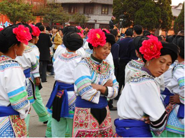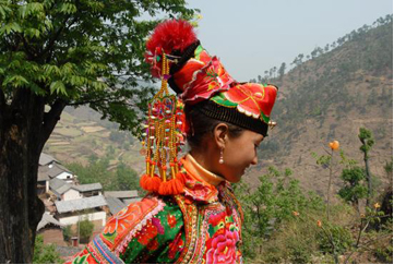 云南巍山彝族回族自治縣各民族如壯麗的織錦,將生活裝扮得五彩繽紛,充滿詩情畫意。其中特別是東山一帶的彝族服飾色彩較為豐富,款式變化多姿,并且以大量的銀制品和刺繡裝飾,制作工藝之精良,堪稱少數(shù)民族服飾一絕。以小孩帽而言,就有魚尾帽、小瓢帽、銀鼓帽、花帽和搭耳帽等數(shù)十種,名目繁多,式樣各異。帽子上都繡有花草、樹葉、龍鳳圖案,鑲嵌著閃亮的銀首飾,十分逗人喜愛。小孩的衣服式樣也很多,大多由紅、藍(lán)、綠、白幾種顏色的布料縫制而成,紅綠交織,藍(lán)白相襯,非常艷麗。如花朵一般的彝族少女通常頭戴銀鼓帽,墜耳環(huán)、身穿藍(lán)領(lǐng)褂,腰系花圍裙,下著綠彩褲,背掛圓裹背。銀鼓帽和繡花鞋做工極為精巧,全套裝飾花團(tuán)錦簇,恰似一只開屏的孔雀。結(jié)婚后的婦女就不再戴帽子,改為結(jié)發(fā)髻,裹包頭。發(fā)髻一般呈寶塔狀,外裹黑紗和黑布包頭,發(fā)髻上戴“別子”?!皠e子”其實(shí)就是發(fā)卡,均為銀制品,分為四串,每串有兩個燈籠繡球,兩個響鈴和兩尾小魚。包頭巾外再用銀串珠、亮球飾之。上衣著右衽大襟,前短后長、領(lǐng)、袖及襟邊則鑲以多層不同的金銀絲瓣或自繡花紋的多層寬窄不同的花邊。外罩齊腰藍(lán)布短領(lǐng)褂,領(lǐng)口上安裝著七個用銀鼓釘湊成五個葉子,狀如葵花形,彝語叫“披巴”的裝飾。領(lǐng)褂四周皆用銀鼓釘鑲邊,共四排,每排36顆。一件領(lǐng)褂上需有兩百多顆銀鼓釘,加上胸前佩戴銀制的“三須”針筒,“菱角吊”串珠和雞心型繡花荷包,整個裝飾真是銀裝素裹,分外嬌嬈。腰間系的圍腰布上,鑲嵌多層金銀絲瓣或自繡圖案的花邊。圖案有串枝蓮、牡丹花、太陽花及鳳戲牡丹、丹鳳朝陽等。無論未婚和已婚婦女,背上都有一個用羊毛搟制而成的圓型繡花裹背,直徑約一尺不等,內(nèi)外兩層,中可承物,上繡兩對太陽花,一大一小,對稱排列。裹背除用作裝飾外,還可保護(hù)腰部,既有欣賞價值,又有實(shí)用價值,這在巍山彝族服飾中是最為典型的一件飾物。銀鼓帽繡有42朵小花,鑲有96顆銀鼓釘,帽頂插有花一朵或釘有櫻花一束。其帽形如金魚,魚頭魚身為帽,魚尾多岔分為護(hù)頸,亦稱為“魚尾帽”。繡花鞋呈船形或鳳頭形,鞋面繡有40余朵小花,紅色中夾有40余片綠葉。如果是新娘鞋,則用紅色或粉色的軟鍛做鞋面,更為講究。