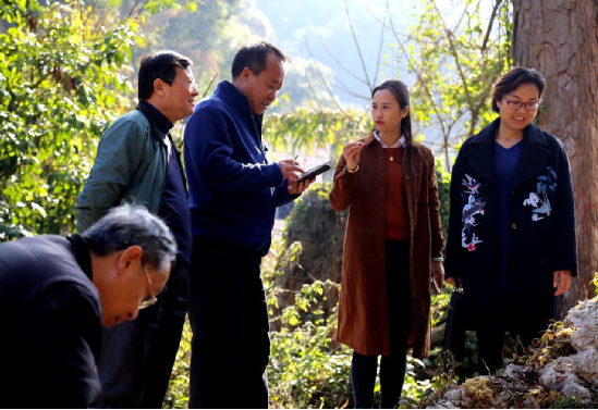 廣南凌婭原生鐵皮石斛科技有限公司董事長(zhǎng)周藝暢(右二)給云南社科專家介紹種植鐵皮石斛情況。(蘭天明攝影)