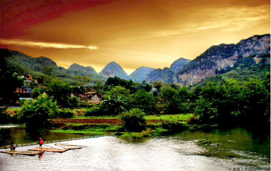 壩美,為壯語(yǔ)譯漢語(yǔ)為:壩—沖口,美—樹(shù) ,因居住的沖口樹(shù)木多而得名。壩美村位于珠江流域西江水系馱娘江上游的阿科河畔。屬喀斯特地貌,區(qū)域內(nèi)山峰奇特,河谷幽美,阡陌縱橫,河流山泉蜿蜒奔流,溶洞層疊散布在山體峰內(nèi),冬無(wú)嚴(yán)寒,夏不酷暑,氣候宜人。因四面環(huán)山,不通公路,進(jìn)出寨子主要靠村前村后兩個(gè)天然的石灰溶巖水洞,村民們要摸著巖壁趟水、撐竹筏、劃獨(dú)木舟、坐小船,經(jīng)過(guò)950米長(zhǎng)的幽暗的“出水洞”和680米長(zhǎng)的“湯拿洞”才能進(jìn)出。由于地處偏僻,交通不便,基本不與外界交往,多年來(lái)壩美村長(zhǎng)時(shí)期與外世隔絕。壩美村水源豐富,氣候溫和,自然生態(tài)環(huán)境未被污染,負(fù)氧離子質(zhì)數(shù)高出城市數(shù)倍,游人在此休憩,心曠神怡,是一個(gè)溫濕潤(rùn),四季宜人的旅游勝地。就生態(tài)環(huán)境和歷史淵源來(lái)說(shuō),《桃花源記》問(wèn)世1500多年,只聞其名,不見(jiàn)其實(shí)。相傳除唐代確認(rèn)湖南省桃源縣的桃源洞為其原型外,目前全國(guó)就有冠名“世外桃源”的地名16個(gè)之多。而今天的壩美,不僅十分相似,而且還神似東晉文學(xué)家陶淵明筆下所描寫的“林盡水源,便得一山。山有小口,仿佛若有光;便舍船從口入……土地平曠,屋舍儼然,有良田美池桑竹之屬;阡陌交通,雞犬相聞……”的世外桃源。而且在當(dāng)?shù)卮迕裰杏性S多歷史傳說(shuō):北宋皇祐四年(公元1052年),壯族起義領(lǐng)袖儂智高在邕州(南寧)昆侖關(guān)被狄青打敗后,退入以其繼父儂夏卿為首領(lǐng)的特磨道(廣南)后,至和二年(1055年),宋朝廷又派楊文廣領(lǐng)兵進(jìn)剿,儂智高在突出重圍轉(zhuǎn)至阿科(今廣南縣壩美鎮(zhèn)治所)與宋軍周旋,終因寡不敵眾而離開(kāi)阿科轉(zhuǎn)戰(zhàn)于丘北、開(kāi)遠(yuǎn)、蒙自、元江等地,后到大理不知所終。