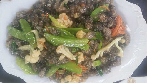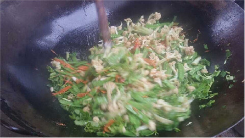 烹制蚵柳,先要挑選好個肥形大的鮮蚵,用心幾遍洗凈,再用篩細的地瓜粉薄薄拌勻,務求每只蚵仔獨立成團,再兜在漏勺里到滾開的水里焯一下即起來,再攤放有竹篩簸里晾干瀝水一個晚上。第二天中午烹制,先把油燒熱,倒入生姜末過油,再依次倒入花菜、荷蘭豆、紅蘿卜絲、芫荽等“菜腳”與鹽、雞粉、料酒、蠔油、胡椒粉、醋等佐料一并翻炒,菜蔬生汁,試嘗咸淡,再倒入已備好的蚵仔團翻炒,只需幾下,便已熟透,即可裝盤。