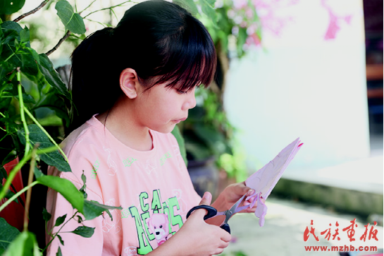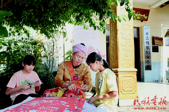 邵梅罕在剪紙藝術(shù)館前教孫女們傣族剪紙。