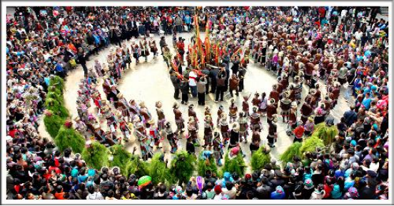 蘆笙踩堂開(kāi)始時(shí),首先舉行開(kāi)堂儀式,向蘆笙柱祭祀。蘆笙柱是苗族的圣物,用高達(dá)10米以上的完整杉木制作而成,柱頂立一只錦雞(苗族崇拜的一種鳥(niǎo)),雞頭向東,寓意吉祥;柱身盤(pán)著一條金龍,體現(xiàn)苗族與漢族的文化融合;還有苗族崇拜的牛角和十字架。寨老和蘆笙頭分別敬上三杯酒和燒三柱香,感謝神靈和祖宗保佑,祈求坡會(huì)成功、新年萬(wàn)事如意。緊接著,蘆笙頭拿起小蘆笙,圍繞一個(gè)曲調(diào)反復(fù)吹三遍,拉開(kāi)蘆笙踩堂表演的序幕。