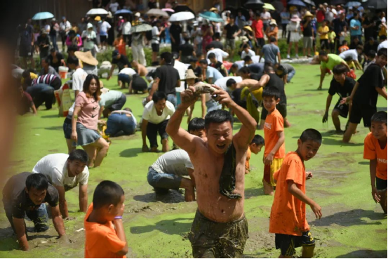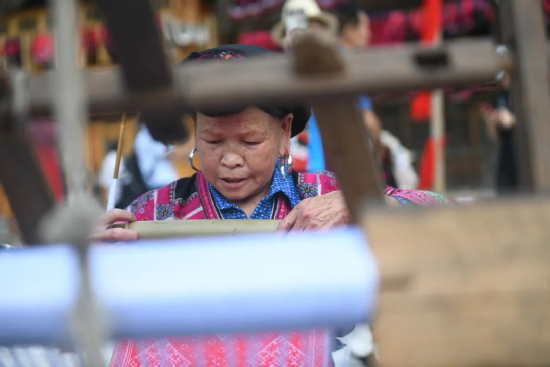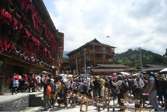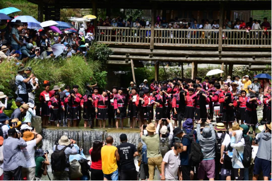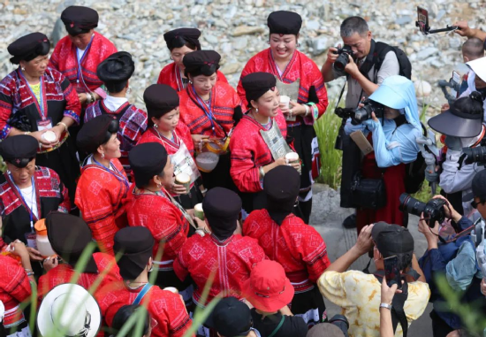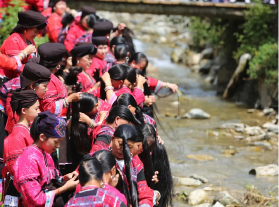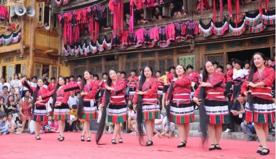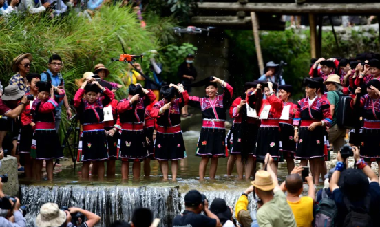 曬衣節(jié)當(dāng)天還進(jìn)行了嗩吶鑼鼓迎賓、瑤嫂長(zhǎng)發(fā)梳妝展示、“抬金狗”送祝福、紅瑤服飾加工展示、紅瑤集體婚禮等活動(dòng),豐富多彩的民俗文化、濃郁的民族風(fēng)情,讓各地游客流連忘返。