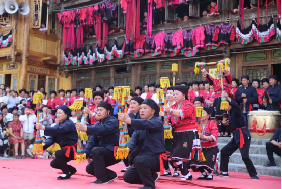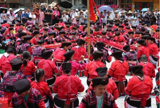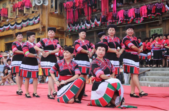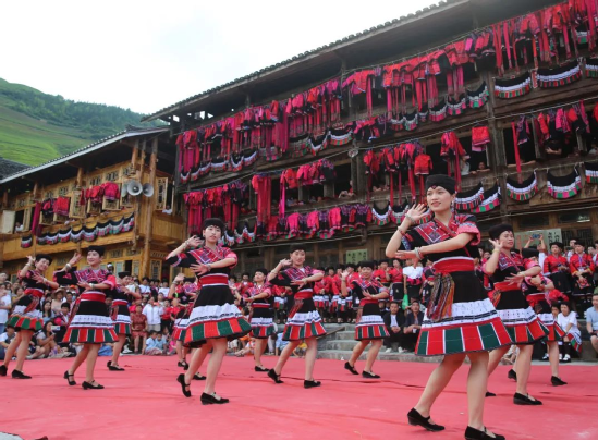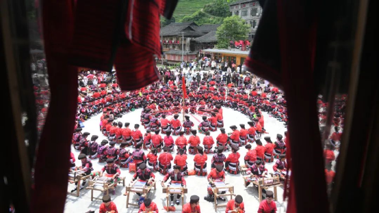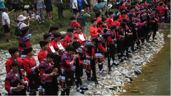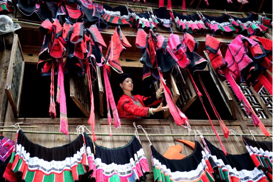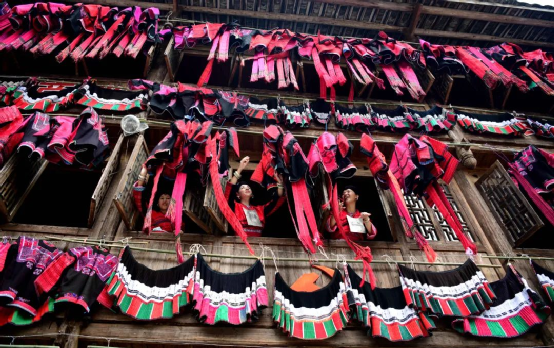 這一天,寨子里賓客盈門熱鬧異常,嫁出去的女兒和在外寨入贅的兒子都要挑著鴨子、酒和禮品,背著小孩回家吃團(tuán)圓飯,家家戶戶包粽子過大節(jié)。紅瑤姑娘和嫂子們,紛紛推開窗戶,拿出民族盛裝一件件掛在窗外晾曬,整個(gè)寨子掛滿了紅衣服,顯得格外鮮艷奪目。