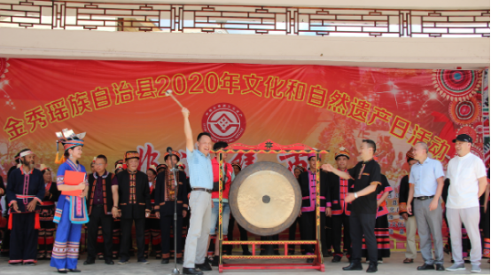 “擊鑼開市”“山歌傳情”“瑤醫(yī)問診”“吃樹葉豆腐”“跳黃泥鼓舞”,6月13日,廣西來賓市金秀瑤族自治縣2020年“文化和自然遺產(chǎn)日”——“非遺集市”活動(dòng)在羅香鄉(xiāng)橫村瑤寨拉開序幕。廣西壯族自治區(qū)非物質(zhì)文化遺產(chǎn)保護(hù)中心書記朱鳳立、金秀瑤族自治縣人民政府副縣長(zhǎng)馬峰為“非遺”集市“擊鑼開市”。