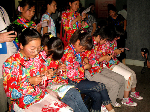 內蒙古和林格爾剪紙是中國北方剪紙最具代表性的剪紙文化遺存之一,是由世代生活在和林格爾地區(qū)的農牧民勞動婦女為主體創(chuàng)造的,經(jīng)過代代傳承發(fā)展,成為承載本土民族文化基因的重要的非物質文化。二十世紀七、八十年代以來,隨著經(jīng)濟社會向工業(yè)文明的急速轉型,人們的生產(chǎn)、生活方式和觀念發(fā)生了重大轉變,和林格爾剪紙面臨消亡的境地。老一輩和林格爾民間剪紙傳承人大都生活窘困,有許多已相繼辭世,她們長達七、八十年藝術實踐所形成的這一古老文化傳承也因此面臨人亡藝絕,而年輕一代剪紙隊伍又尚未形成,和林格爾剪紙的發(fā)展出現(xiàn)了青黃不接的瀕危狀況。帶著全社會的關注,1998年7月10日,在時任和林格爾縣委宣傳部長姚子明同志的支持下,和林格爾縣成立了內蒙古自治區(qū)第一個旗縣剪紙學術組織——和林格爾剪紙學會。和林格爾剪紙學會的成立,是和林格爾剪紙文化事業(yè)發(fā)展的一個里程碑和轉折點。多年來,和林格爾剪紙學會克服困難,深入搶救、發(fā)掘、整理和保護了縣境一大批珍貴的原生態(tài)剪紙遺存和老一輩剪紙傳承人。從1994年到2010年,共已累計搶救、發(fā)現(xiàn)珍貴的原生態(tài)和林格爾剪紙七萬余幅,發(fā)現(xiàn)和保護老一輩剪紙傳承人2600余人,其中有140余名70歲以上的老一輩剪紙傳承人,學會做為重點搶救、考察對象而開展了全年跟蹤式搶救、保護和記錄。和林格爾剪紙學會對已發(fā)現(xiàn)的老中年剪紙傳承人給予物質獎勵和精神關懷,激活了人們對于剪紙傳承的積極性和創(chuàng)作熱情,以農村婦女為主體的傳承群體又重新拿起剪刀,開始了剪紙的傳承和傳播。多年來,和林格爾剪紙學會在段建珺會長的帶領下,以“讓老大娘們重新拿起剪刀,讓年輕一代傳承剪紙”為宗旨,積極開展各類剪紙活動,努力探索剪紙在新形勢下的教育傳承和發(fā)展工作,涌現(xiàn)出以張花女、段建珺等為代表人物的一大批才華橫溢,在國內外有影響的杰出剪紙傳承人和經(jīng)典剪紙作品。百歲剪紙大師張花女出生于清代光緒年末年,剪紙學會發(fā)現(xiàn)她時,老人已是96歲高齡。在學會的幫助下,她重新拿起剪刀,傳承和創(chuàng)作了大量剪紙,堪稱珍品。張花女的作品,將剪和紙的特性發(fā)揮到了幾盡完美的境界,圓潤而不浮華,凝重而不果板,簡約而不單簿,通俗而不失典雅。她剪的《魚龍變化》、《蒙人進城》、《碾場》等作品,反映了遠古時期仰韶文化與紅山文化、中原文明與草原文明在該區(qū)域碰撞、交流、融合的歷史遺存,具有很高的藝術考古價值。在長達一個多世紀生命的最后幾年中,張花女用剪刀和紅紙創(chuàng)造了一個當代中國剪紙的神話。