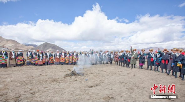 圖為拉薩市林周縣朱加村,村民穿著節(jié)日盛裝舉行傳統(tǒng)春耕儀式。林周融媒 供圖