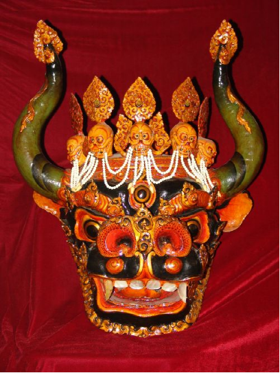 據(jù)普布次仁介紹,早在吐蕃王朝時期,西藏就有宗教舞蹈羌姆和名為“吉達(dá)吉姆”的歌舞劇?!凹_(dá)吉姆”在演出時演員要戴上白色面具,其表演的內(nèi)容是請求天神降雨或不要讓本地出現(xiàn)冰雹、刮大風(fēng)等自然災(zāi)害。這種歌舞劇在今天的日喀則地區(qū)仍然存在,人們常將之稱為“抗災(zāi)歌舞”。而在宗教舞蹈羌姆中,面具多數(shù)是根據(jù)佛經(jīng)及寺院殿堂中的塑像制作的,制作手法要求較高,以立體造型為主。