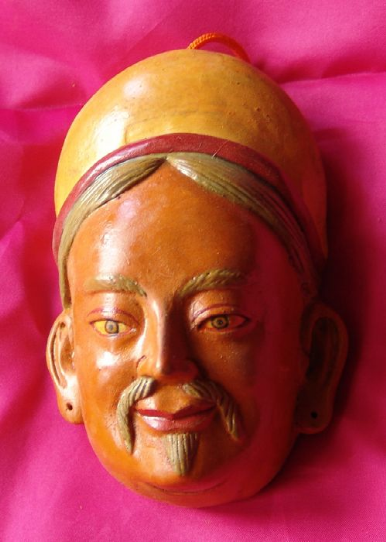 泥塑面具的制作也很有講究:“首先要將面具模型徹底風(fēng)干,然后在表面敷上摻有液體樹膠和面粉熬制而成的糨糊,再用一小塊布將風(fēng)干好的模子包好裹嚴(yán),接著要敷一層柴薪混合物,同樣用另一塊布把泥模包實,反復(fù)四五次后,將模子放好讓它自然干透。這些步驟做完后,要用一根棍子敲打出包在里面的泥模,這樣就形成了布、樹、膠和面粉做成的一種面具。當(dāng)然,做好后還要進(jìn)行彩繪、涂清漆,這樣才能讓一個面具光彩奪目?!边叞驼f道。