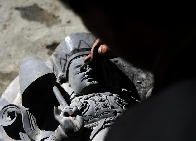伴隨著收音機(jī)傳出的旋律,西藏自治區(qū)級(jí)黑玉石雕刻技藝非物質(zhì)文化遺產(chǎn)傳承人土登加措和他的徒弟們開(kāi)始了又一天的黑玉石佛像雕刻工作。黑玉石產(chǎn)生于海拔4500米以上的石山上,是高原特有的一種石材。據(jù)古書(shū)記載,西藏第一代藏王聶赤贊普曾將天降的經(jīng)書(shū)、塔模等佛教圣物封存于洞中,并以黑玉石雕刻佛塔做蓋,于是便有了西藏歷史上有記載的第一件黑玉石雕刻作品。作為這門(mén)技藝的第五代傳人,土登加措延續(xù)著家族的技藝,一直傳承著這門(mén)古老的技藝。西藏黑玉石雕刻技藝在2012年入選第四批西藏自治區(qū)級(jí)非物質(zhì)文化遺產(chǎn)名錄,土登加措如今已有近30名弟子,古老的黑玉石雕刻技藝正在慢慢走向世界。新華社記者 晉美多吉 攝