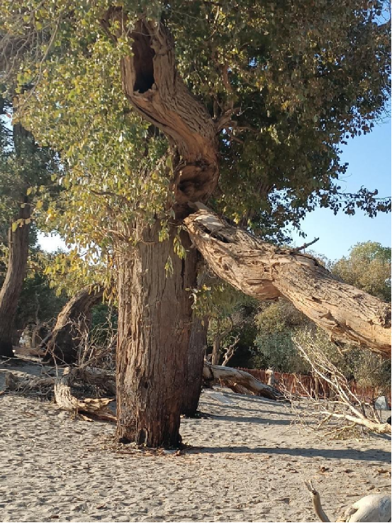 每當(dāng)深秋季節(jié),胡楊樹葉變得一片金黃,形成胡楊秋色,樹影婆娑,奇妙絕倫,賞心悅目。漫步在濃郁的胡楊林中仿佛進(jìn)入神話般的仙境。茂密的胡楊千奇百怪,神態(tài)萬般。粗壯的幾人難以合抱,挺拔的七、八丈之高,怪異的似蒼龍騰越,似虬蟠狂舞,令人驚奇不已,嘆為觀止。僅就密密匝匝的樹葉,也是風(fēng)采獨有。幼小的胡楊,葉片狹長而細(xì)小,宛若少女嫵媚的柳眉,人們常常把它誤認(rèn)為柳樹;壯齡的胡楊,葉片又變成卵形、闊卵形或三角形,猶如興安嶺的白樺;進(jìn)入老年期的胡楊,葉片才定型為橢圓形。更令人稱奇者,在同一棵胡楊樹冠的上下層次,還長著不同形狀的葉片,因此,又稱“異葉楊”