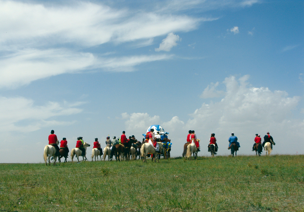 女方家最盛大的婚宴就要開(kāi)始了。宴畢,新娘就要出嫁。所以也稱“離娘宴”。同時(shí)也意味著新郎要迎接最后一道過(guò)關(guān)考試。先輪流給賓客叩頭敬酒,接受女方家親戚贈(zèng)送的衣服佩飾,穿上才可以娶走新娘。進(jìn)膳時(shí),新郎必須當(dāng)眾掰開(kāi)一個(gè)半生不熟的羊脖子,一般羊脖子里總要塞根紅柳棍,以考驗(yàn)新郎的腕力和智力。宴后,新娘就要登程,女友們把新娘團(tuán)團(tuán)圍住,進(jìn)行“阻嫁”,男方奮力搶親。之后,開(kāi)始裝扮新娘。館頭額吉解開(kāi)新娘的大辮,蘸著碗里的清水,梳得油光凈亮,把鏈垂頭飾戴上,意味著少女時(shí)代就此結(jié)束,今后將以少婦的形象出現(xiàn)。女方送親的人準(zhǔn)備好騎乘,在悠揚(yáng)的禮贊聲中,蒙著紅紗的新娘由倆位胞兄牽著,緩緩穿過(guò)人群上了紅馬,向婆家走去。這時(shí),女方賓客唱起惜別的歌為她送行,直唱得新娘淚如雨下,不時(shí)地停馬回望【圖為四子王草原接新娘馬隊(duì),趙文耀攝】。