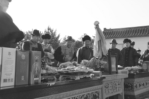 白酒、點(diǎn)心、干果,長(zhǎng)長(zhǎng)的條案上,擺放著各式祭品