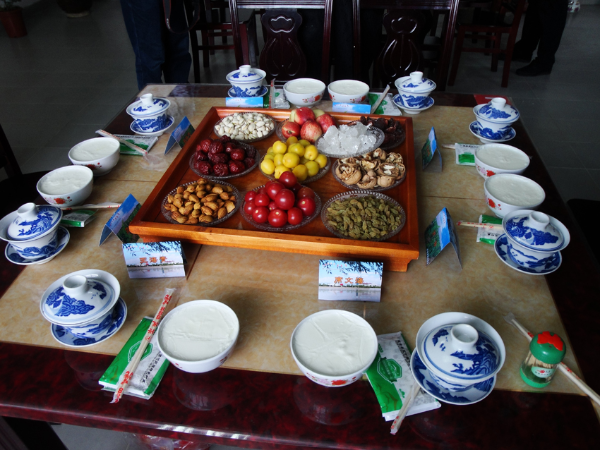 回族普遍喜歡飲茶。回族先民喜食甜品,在中國茶文化影響下,形成了以甜味為特色的飲茶習(xí)慣。飲茶之風(fēng)興起于中國晉代,盛于唐代以后,隨之出現(xiàn)了茶具,其中以包括茶托、茶碗、碗蓋的“三坯胎”蓋碗美觀實(shí)用?;刈謇^承發(fā)展了這種茶文化,形成了以“三炮臺(tái)”為茶具的“八寶蓋碗茶”:在茶具中放入茶葉(茉莉花茶、陜青茶、紅磚茶、窩窩茶、毛尖等)、糖(白糖、紅糖、冰糖、梨膏糖等)及紅棗、核桃仁、桂圓肉、芝麻、葡萄干、枸杞(或柿餅、山楂、姜片、果干)等配料,用開水沖制后飲用。茶葉及配料在不同的地區(qū)、不同的季節(jié),根據(jù)飲茶者的身體狀況與喜好有不同的搭配,如“紅糖磚茶”“冰糖陜青茶”“三香茶”(茶葉、糖、桂圓)、“白四品”(陜青茶、白糖、柿餅、紅棗)、“紅四品”(磚茶、紅糖、紅棗、果干)、“五味茶”(綠茶、山楂、芝麻、姜片)等。八寶茶具有生津解渴、開胃健脾的作用,放入不同的茶料,又具備了不同的健身康體功能。