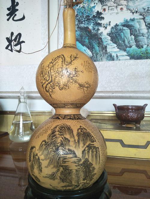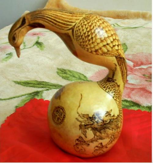 葫蘆雕集繪畫、書法、篆刻藝術(shù)于一體,傳承和發(fā)展了我國(guó)傳統(tǒng)“葫蘆文化”。甘肅的雕刻葫蘆最早出產(chǎn)于蘭州,距今約100多年,據(jù)說早期的蘭州雕刻葫蘆比較簡(jiǎn)單,對(duì)葫蘆不會(huì)做刮皮、磨光等加工處理,也不填色;只是在葫蘆表皮雕刻出山水、風(fēng)景或戲劇人物,作為兒童的玩具,在街頭巷尾出售。到了清代光緒年間,秀才蘭州人李文齋對(duì)葫蘆雕刻工藝做了改進(jìn)。他針對(duì)當(dāng)時(shí)雕刻表面粗糙、題材單調(diào)的弊端,首先將葫蘆原生表皮刮去、磨光,并用鏹水混合燃料,染成紅黃二色,是雕刻的景物不易脫落;其次,擴(kuò)大圖案創(chuàng)作題材,在原有山水、花草等圖案基礎(chǔ)上,增加了如《桃花源記》、《蘭亭集序》、《竹林七賢》等歷史文化和神話故事,形成了圖文并茂的題材格局;最后是在雕刻工具上采用了以針代刀,使圖案形象更加情景交融,栩栩如生。其雕刻葫蘆的特點(diǎn)主要是求其意態(tài)之美,追求神似;人物寥寥數(shù)筆,山水花卉濃淡相宜,形神兼具,求其風(fēng)雅;題款文字、細(xì)如蚊足,點(diǎn)綴成行,瀟灑自如。