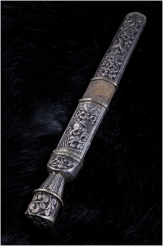 康區(qū)人性格粗獷豪放,刀對于他們來說,主要是戰(zhàn)斗的武器,他們愛刀勝過愛牛羊,一把好刀就是一筆財富,其形象也會因之而無形中高大起來。正因為如此,他們不僅對刀本身有較高的要求,對其作為襯托武士氣概的刀的外在形制也有特殊的喜好。刀鞘材料一般使用黃、白銅或純銀,鑲珠嵌寶,正面雕龍畫鳳,背面線刻卷草,佩在身上,起到了美觀和威懾的雙重作用。