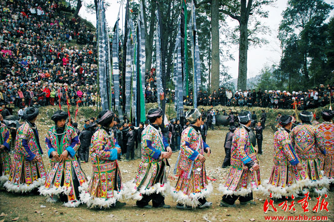 花山節(jié)又名“踩花山”、“跳花場”、“踩場”、“踩山”等,流行于貴州黔西北、四川南部和云南東南部的苗族地區(qū)。由于苗族住地不同,因此,苗族過花山節(jié)的日期也不一致,節(jié)日的名稱也不盡相同。有的在農(nóng)歷正月,有的在六月,有的在八月。在黔西北的鐵盔一帶,每年正月初六至初八跳年場,二月十四至十六日跳桃花場,七月十六至十八日跳米花場。先選好接花種或接花稈。所謂“接花種”,就是用三匹馬掛紅,去其他花場上馱少量的泥土來堆積在新場上,以示花種;“接花稈”是用長青樹做成,高三至四米,立于花場的中心。屆時(shí),四方八面的人盛裝前來,由族長宣布跳場開始,小伙子們吹響蘆笙,姑娘們圍著花翩翩起舞,互相競技。在花稈的頂上懸有一幅兩米長的紅綢和一個(gè)紅布小包,內(nèi)裝賞錢。誰能一邊吹笙,一邊爬上花稈頂端,取下紅綢(有的掛一壺酒)和紅布小包,并且還能從稈頂吹笙下來,誰便獲勝得賞。有的地方還兼舉行賽馬、射箭及續(xù)麻針比賽等活動(dòng)。青年男女對歌,演奏蘆笙、簫、笛、口弦等民族樂器,鐘情者互贈(zèng)繡花手帕、腰帶等物。老年人則趁機(jī)拜訪親友,互相談心,活動(dòng)一整天,甚至到深夜結(jié)束。