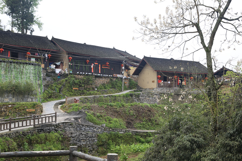 梨子寨共有28戶(hù)人家,當(dāng)年全寨烏黑破落的房屋如今全部修繕一新,并保持了苗族民居青瓦、木板、竹籬、黃泥墻的特色,寨子里的泥土路也鋪上了青石板,屋頂、院壩、石階、游道及田頭落滿了白色梨花花瓣。穿青衣包頭帕的苗族女子在田間鋤地、拔草,青山環(huán)抱的梨子寨無(wú)比清幽。