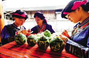 在貴州省天柱縣地湖鄉(xiāng)永光村,苗族姑娘們聚在一起學(xué)習(xí)蜜餞雕刻技術(shù),爭當(dāng)技藝傳承人。