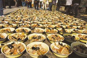 壩壩宴最能體現(xiàn)出金陽(yáng)人的飲食文化。但要吃出味道,吃出氛圍,則大有講究。在形式上,吃飯聲勢(shì)要大,食客多多益善。在內(nèi)容上,肉要多,平均每個(gè)人至少有5塊坨坨肉。如果不夠吃,辦酒的主人家就會(huì)覺(jué)得丟臉,別人也會(huì)有所議論。一般來(lái)講,一桌上一盆肉,8斤左右為宜。
