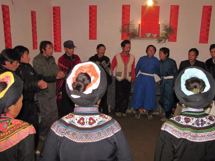 4、源自于搶婚習俗。以前,在彝區(qū)還有暴力阻攔或嘲弄接親人的習俗,這種習俗因搶婚相反,我們姑且稱之為攔婚習俗。何為攔婚?就是女方家就安排出嫁女素日的伙伴在接親隊來的路口守候著,當接親隊來時,抑或用水澆潑接親人,抑或抓粘草籽撒在接親人身上,甚至用蕁麻抽打接人,讓接親人很是吃消不下,既痛苦又尷尬。這種習俗可能源自于古時的搶婚制度。古時,經(jīng)濟文化落后之時,禮儀制度還不健全,存在著搶婚的現(xiàn)象,女子無法主宰自己的命運,被當作財產(chǎn)和工具被男人搶奪。隨著禮儀制度的興起,女子的自我意識和維權(quán)意識有了增強,她們內(nèi)心深處極力反對婚姻壓迫和搶奪,希望與男子取得平等的待遇。于是就開始出現(xiàn)了阻攔和戲弄接親人的習俗。阻攔和嘲弄接親人的方式多種多樣,也從最早的野蠻方式逐步向文明過渡。應(yīng)該說,阿買懇是攔婚習俗的延伸與發(fā)展,又折射出了搶婚的影子。阿買懇設(shè)置了幾十道盤歌的關(guān)卡,每道關(guān)卡都需要智慧和才藝,這是一種傳統(tǒng)習俗繼承中的文明發(fā)展表現(xiàn)?!鞍①I懇”的“懇”,除上面講的有“跳舞”、“歌舞”之意外,還有“搶”、“奪”之意。綜上所述,阿買懇蘊含了搶婚制中深層次的文化心理積淀。