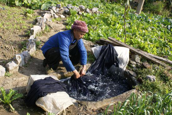 從前壯族鄉(xiāng)村,普遍掌握制作藍靛及印染方法。一般置一大缸,將藍草放入浸泡,加石灰使之分解、發(fā)酵,經(jīng)過化學(xué)變化,而后濾去殘渣,蒸發(fā)水分,凝成糊狀藍色染料。其間需不斷攪動,使色素充分化解?!懊康宀萘俳铮斐梢话俳镏鍨榧??!币虍a(chǎn)量較多,遠銷廣東。浸染時,將適量靛糊化于染缸中,同時將雞血藤搗碎加入。布要反復(fù)浸泡多次,晾泡結(jié)合,直到染為深藍色。其間雞血藤釋放出一種紫紅色的植物膠,將藍靛色素粘在纖維上,是色素耐水耐腐耐紫外線,不易褪色,并有若隱若現(xiàn)的亮點,結(jié)實美觀。這個過程,運用了化學(xué)分解法。