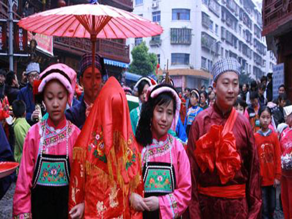 男方的“提親”得到應(yīng)允以后,雙方即開始頻繁往來(lái),加深感情。到了可以談婚論嫁的年齡,便舉行“訂親”儀式。由男方選擇吉日,通知女方做好準(zhǔn)備。那一天,男方家請(qǐng)人抬著用大紅紙封口的一大壇酒、若干塊紅糖、一盤用紅紙包裝的爆竹、一只大公雞,另外還要送彩禮錢若干,其數(shù)量不同時(shí)代、不同地區(qū)有不同的慣例。訂婚儀式后,準(zhǔn)女婿每年給岳父家送一只豬腿、糯米粑及酒等禮物,以示孝敬。
