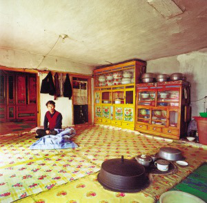 朝鮮族傳統(tǒng)住房不論什么結(jié)構(gòu),都是滿屋炕。進(jìn)屋脫鞋,席炕而坐是他們的習(xí)慣。房門(mén)的門(mén)檻很高,進(jìn)門(mén)是一塊一二平方米大小的屋地,接著是凹下去1米左右的燒火坑,里面是灶膛,放燒柴,平時(shí)蓋著木板,或添足燒柴坐在上面炊事。這樣,蓋板、灶臺(tái)、炕面在同一平面,像延伸了的火炕,既干凈又防火。因房屋較矮,又有大面積的火炕,加上明亮的玻璃窗,在