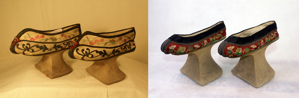 “旗鞋”款式獨特,是一種高木底繡花鞋,又稱“高底鞋”“花盆底鞋”“馬蹄底鞋”等。其木底高跟一般高5-10厘米,最高可達25厘米。一般用白布包裹,然后鑲在鞋底中間腳心部位。跟底形狀通常有兩種,一種上敞下斂,呈倒梯形花盆狀。另一種是上細下寬、前平后圓,其外形及落地印痕皆似馬蹄?!盎ㄅ璧住焙汀榜R蹄底”鞋由此得名。除鞋幫上飾以蟬蝶等刺繡紋樣或裝飾片外,木跟不著地的部分也常用刺繡或串珠加以裝飾。有的鞋尖還飾有絲線編織的穗子。這種鞋的高跟木底極為堅固。