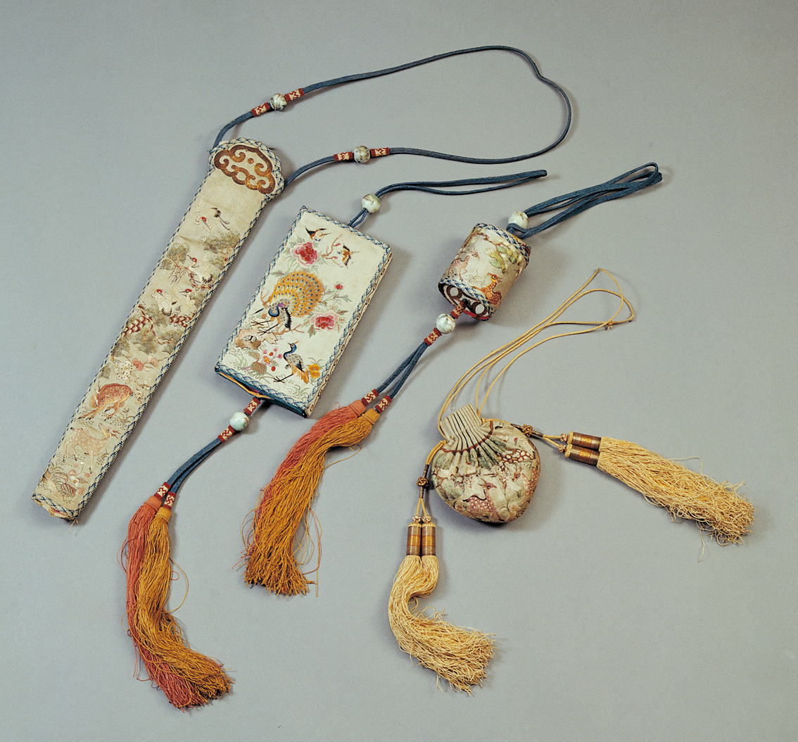 滿族服飾色彩多以淡雅的白色、藍紫色為主,紅、粉、淡黃、黑等色也是其服飾的常用色。白色在滿族服飾中是一個重要的顏色,因為,滿族傳統(tǒng)上有尚白習俗,以白色為潔、為貴,白色象征著吉祥如意,所以,在滿族服飾中常在紅色、藍色等其他顏色的旗袍上鑲白色的花邊。滿族男女都喜愛在腰間或衣服的大襟上掛佩飾。男子有火鐮、耳勺、牙簽、眼鏡盒、扇帶。滿族女子喜歡盤頭翅,梳兩把頭或旗髻,戴耳環(huán)、手鐲、戒指、頭簪、大絨花和鬢花等各種裝飾品。擅長刺繡,她們在衣襟、鞋面、香囊、荷包、枕頭等物品上刺繡花卉、芳草、鶴鹿、龍鳳等吉祥圖案(圖為滿族清代繡花湖色緞佩飾,中央民族大學民族博物館館藏)。