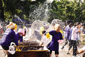 “扁水”是當?shù)胤窖?,為戲水、潑水之意?!氨馑笨駳g節(jié)源于侗族“為也”習俗,為做客之意,指村寨之間村民們的互相訪問,是當?shù)匾?guī)模最大的社交和娛樂活動。“為也”時,當?shù)囟弊迦罕姂蛩?、潑水狂歡,久而久之就形成了“扁水”狂歡節(jié)。