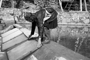 占里村共有182戶827人,這里的侗族古法造紙術源遠流長,全村從事造紙業(yè)的就有170戶,占總戶數的93%。這里的造紙業(yè)依然保留著原始的家庭作坊和世代傳承的手工制作方式。這種古法造紙技藝以構樹皮為原材料,添加獼猴桃藤、野棉花根,經過水浸泡、石灰腌制、蒸煮、碓爛、攤曬、燒堿漂白、打漿、瀝水、抄紙、烤干等72道工序,最終制成白皮紙。