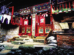 狹長(zhǎng)式的房屋大都建在深山里幾十戶(hù)大小的村寨。面闊一間并開(kāi)正門(mén),室內(nèi)隔間向縱深排列,從正門(mén)到后門(mén)有7道門(mén)之多。正門(mén)是大門(mén)也是第一道門(mén),是家族的門(mén)面,被視為招財(cái)進(jìn)寶和迎接貴客之門(mén)。對(duì)開(kāi)門(mén)扇高大厚實(shí),門(mén)檻上又設(shè)兩扇雕刻彩繪的矮門(mén),天熱開(kāi)大門(mén)通風(fēng)時(shí),可以防止禽畜入戶(hù)。大門(mén)兩側(cè)掛有木刻大字對(duì)聯(lián),大門(mén)墻面的屋檐下則畫(huà)有七彩畫(huà)卷。
