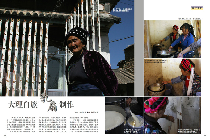 女主人名叫王紅杏,她家做乳扇已經(jīng)很多 年了,手藝是一輩一輩傳下來的。掛好手中的 竹竿,王紅杏帶我來到她家的灶房,乳扇就是 在這里加工而成的,她一邊熟練地往鍋里舀著牛奶,一邊將乳扇的制作過程向我娓娓道來。